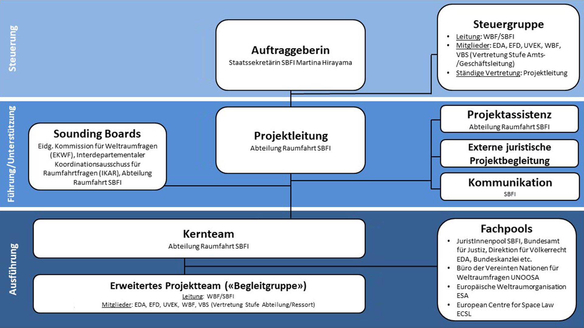 Das Eidgenössische Departement für Wirtschaft, Bildung und Forschung (WBF) hat die Federführung bei der Erarbeitung des Bundesgesetzes über die Raumfahrt. Mitbeteiligt sind das Eidgenössische Departement für auswärtige Angelegenheiten (EDA), das Eidgenössische Departement für Verteidigung, Bevölkerungsschutz und Sport (VBS), das Eidgenössische Finanzdepartement (EFD) sowie das Eidgenössische Departement für Verkehr, Energie und Kommunikation (UVEK).