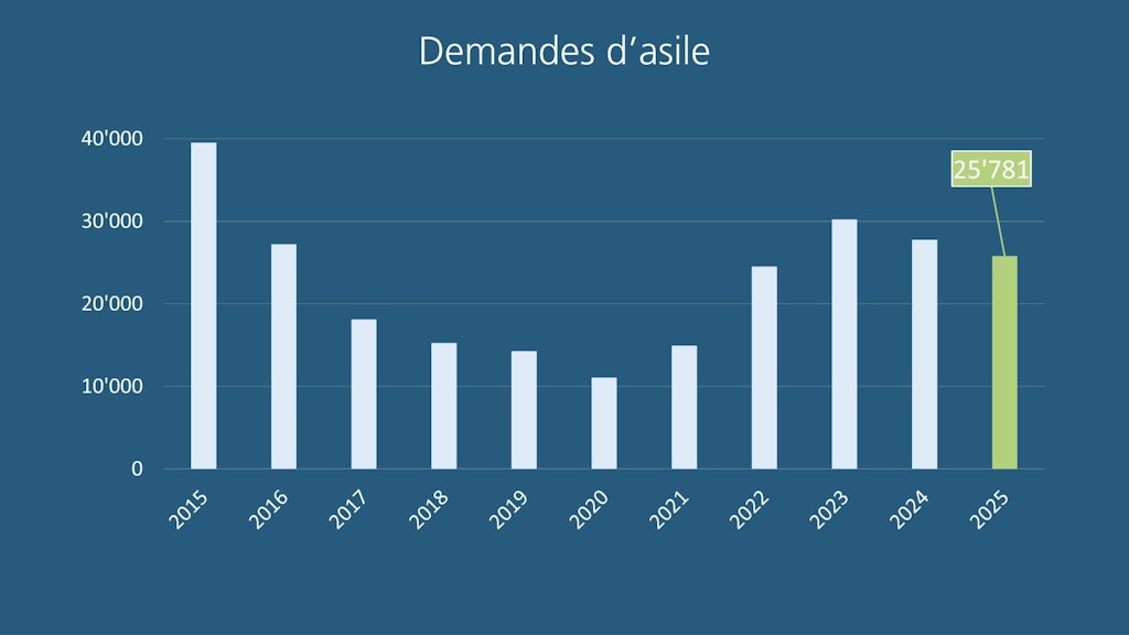En 2025, la Suisse a enregistré 25 781 demandes d’asile, soit 1959 de moins (-7,1 %) qu’en 2024. Parmi elles, 5481 concernent des naissances, des bénéficiaires de regroupement familial, des demandes multiples et des demandes déposées par des personnes qui résident déjà en Suisse.