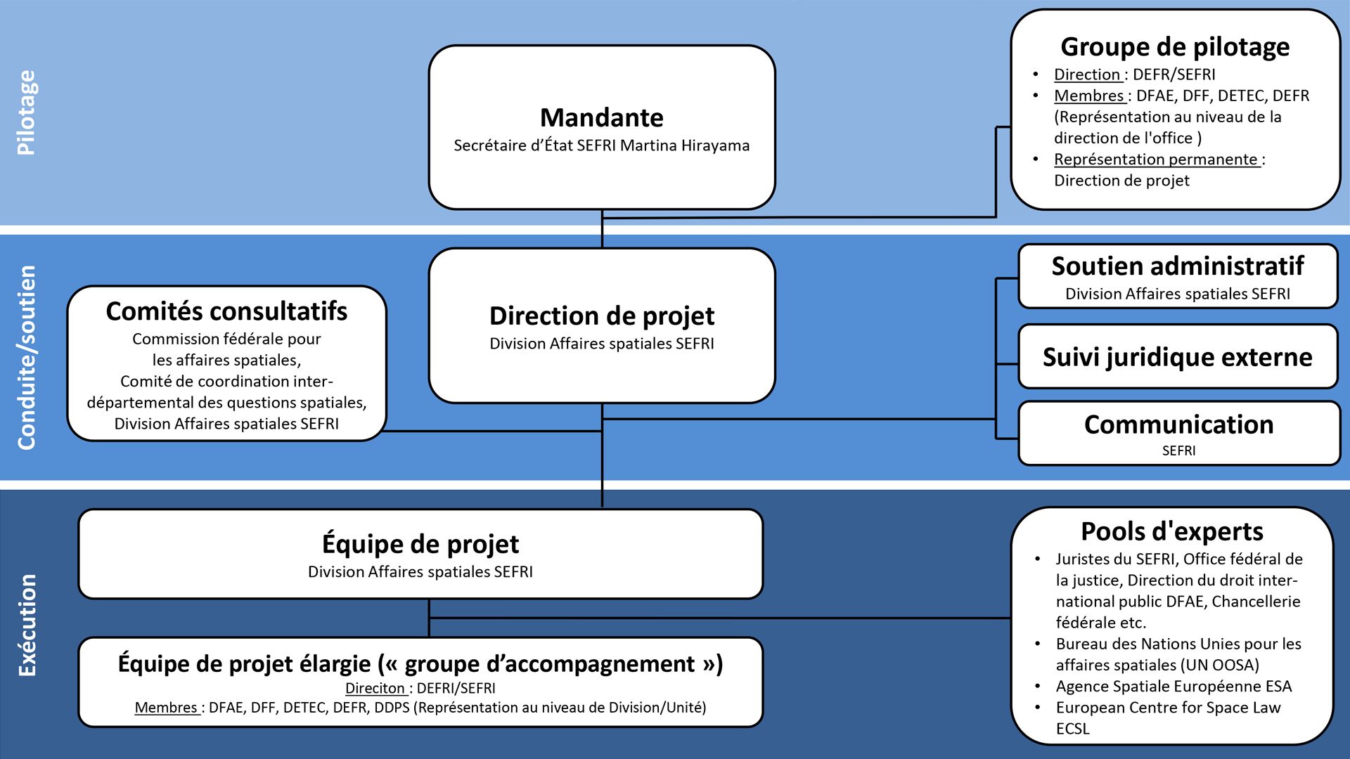 L’élaboration de la loi sur les opérations spatiales nationale est placée sous la direction du Département fédéral de l’économie, de la formation et de la recherche (DEFR). Sont également impliqués dans le projet le Département fédéral des affaires étrangères (DFAE), le Département fédéral de la défense, de la protection de la population et des sports (DDPS), le Département fédéral des finances (DFF) ainsi que le Département fédéral de l'environnement, des transports, de l'énergie et de la communication (DETEC).